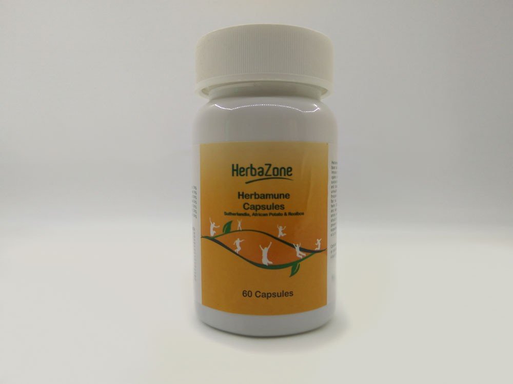 Antioksidante Sutherlandia (Kankerbossie), Spirulina, Afrikapatat, Beta Sitosterole, Kelp en Rooibostee, in kombinasie met Vitamiene A,D,E,C & B kompleks, Sink, Yster en Seleen asook 17 Aminosure maak hierdie produk enig is sy soort wat immuunstelsel tonikums aanbetref. Met gereelde gebruik, sal dit verkoues en griep voorkom, moegheid verlig, energievlakke verbeter en fisiese prestasie op alle terreine verbeter. Herbamune is van besondere waarde vir besige mense wat nie altyd gesond eet nie.